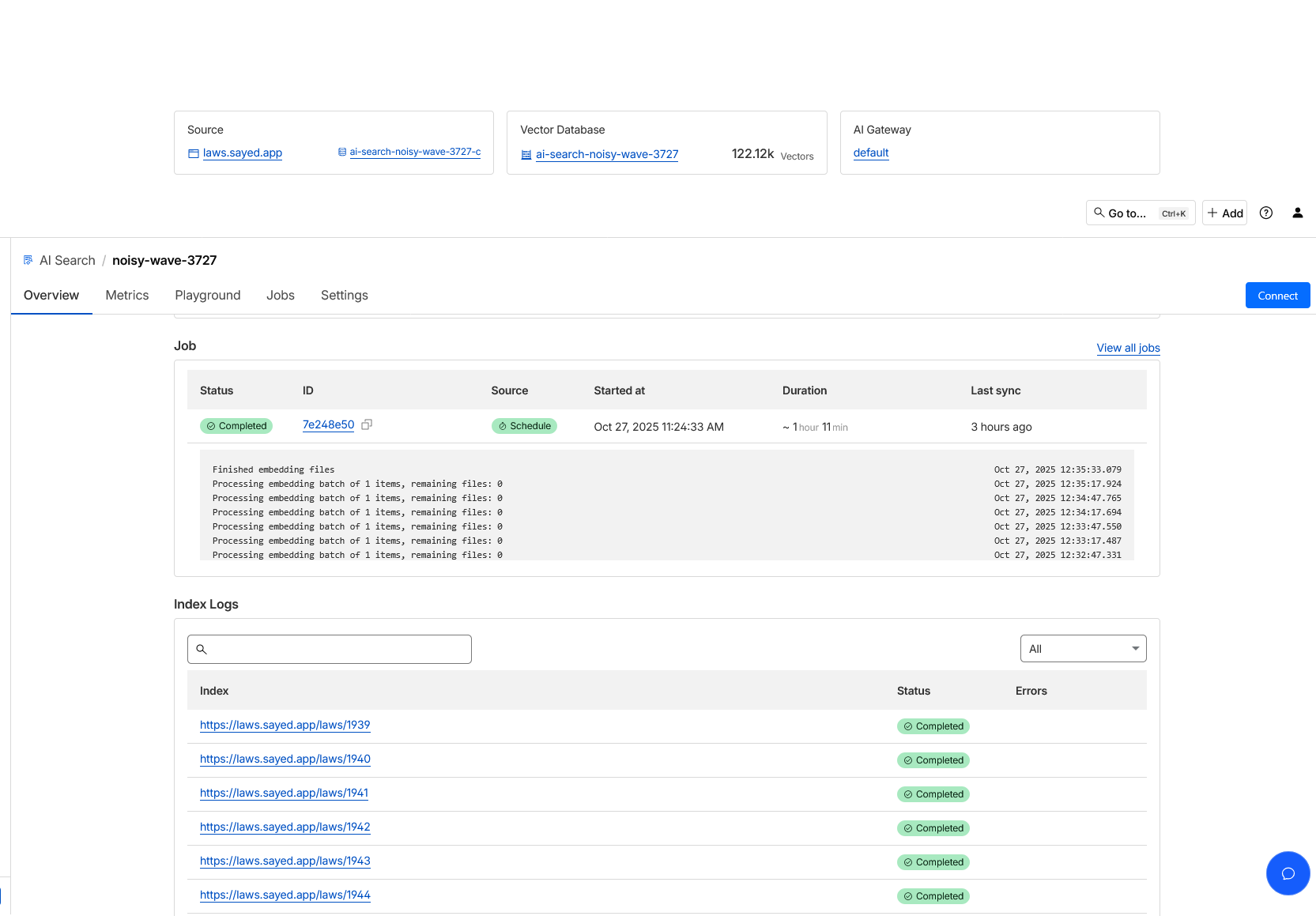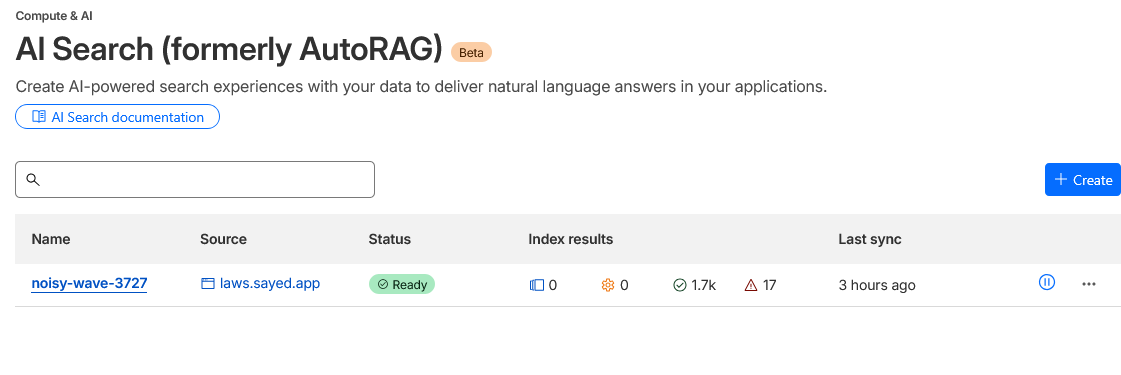 - Then, I discovered AI search (AutoRAG )by Cloudflare. It crawls all the content using the sitemap: https://laws.sayed.app/sitemap.xml and save them in R2 bucket.