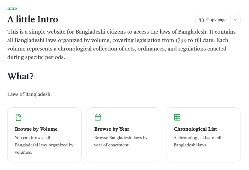 - Using the scraped data I built a website using Mintilfy CMS(Documentation Management software). I could use opensource documentation software like Docurus, mkDocs etc. But, I choosed to use Mintlify as it's free plan was enough for me to host the Laws. Also, Mintlify offers custom domain for free. I didn't take extra hassle to host them.